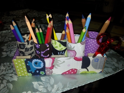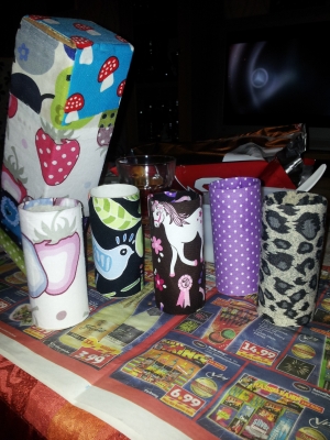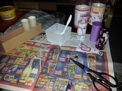 So kam es, daß ich aus Klopapierrollen und den Stoffresten einen Stiftehalter basteln wollte, aber keine Idee hatte wie ich die zusammenbringe so daß sie halten. Dank einiger Möbelkäufe hatten wir ein paar Pappreste und was passendes dabei. Also schnell Tapetenkleber angerührt und los ging es.