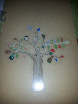 Und hier nun noch ein Zwischenstand des bisher entstanden Stoffbäumchens. Es klebt direkt auf Holz und wahrscheinlich wird der Hintergrund noch zartgrün um eventuelle Schandstellen auf dem Holz zu kaschieren. Auch muss das Holz noch zurechtgeschnitten werden, aber wir werden sehen. Muss ja nicht sofort fertig sein.