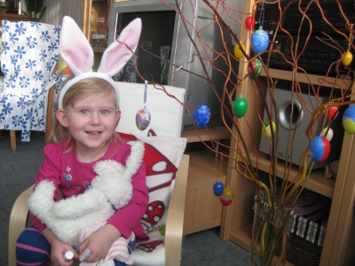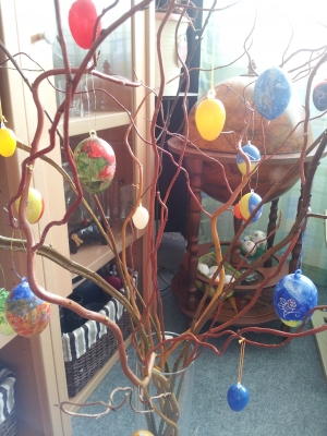 Bald ist Ostern und wir hoffen ganz dringend auf schönes Wetter, denn die kleine Nervzwergin bekommt ein neues Kleidchen… aber pssst. Sie hat ganz fleißig mit mir Eier bemalt und will nun jeder Oma eins schenken. Aber erstmal hängen diese an unserem schönen Osterstrauß.